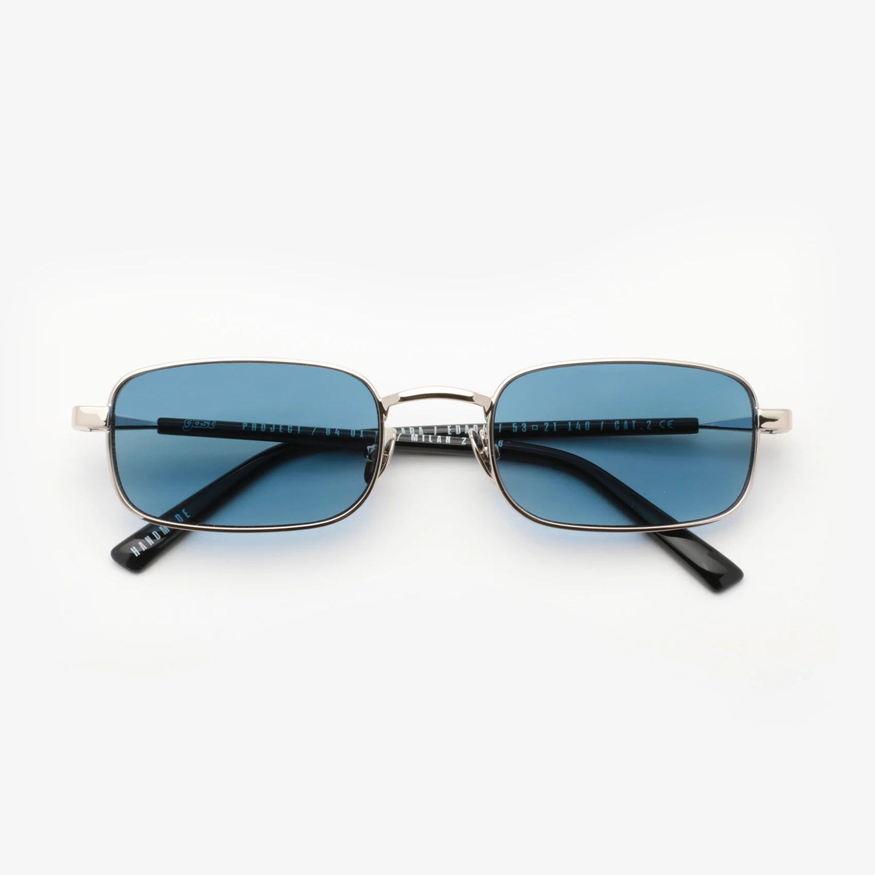 Occhiale da sole fatto a mano con montatura in acciaio argento e aste in acetato nero.
