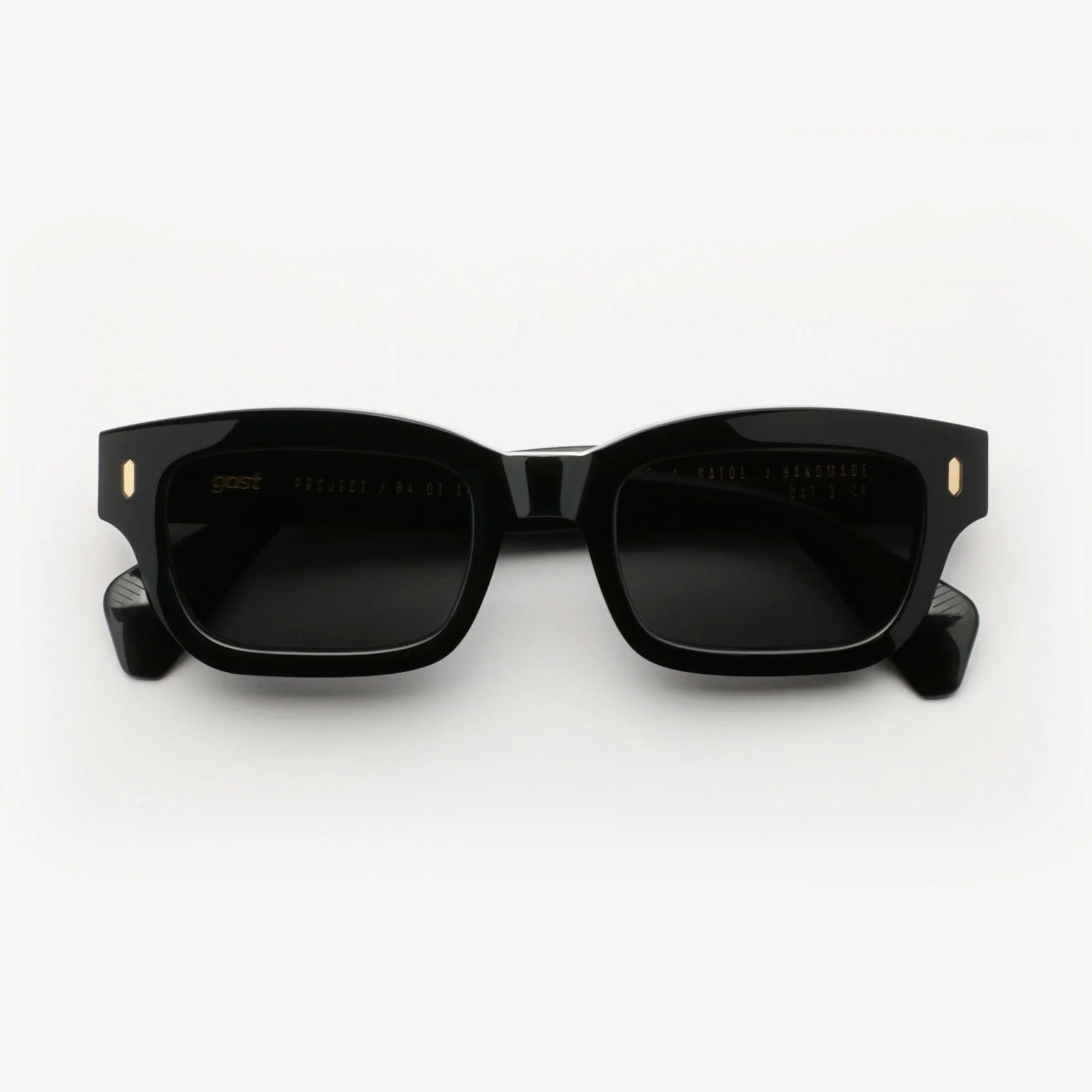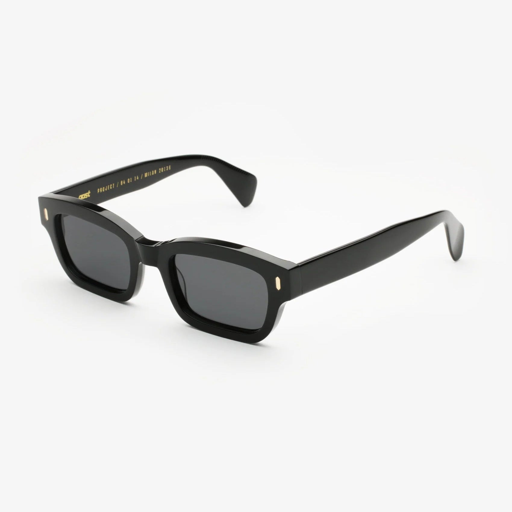 Occhiale da sole fatto a mano con montatura in acetato colore nero e lenti in nylon nere semi-piatte con anti-riflesso interno - Protezione 100% dai raggi UVA / UVB. Cerniere a cinque snodi. Astuccio premium semi-rigido effetto similpelle e panno in microfibra inclusi.