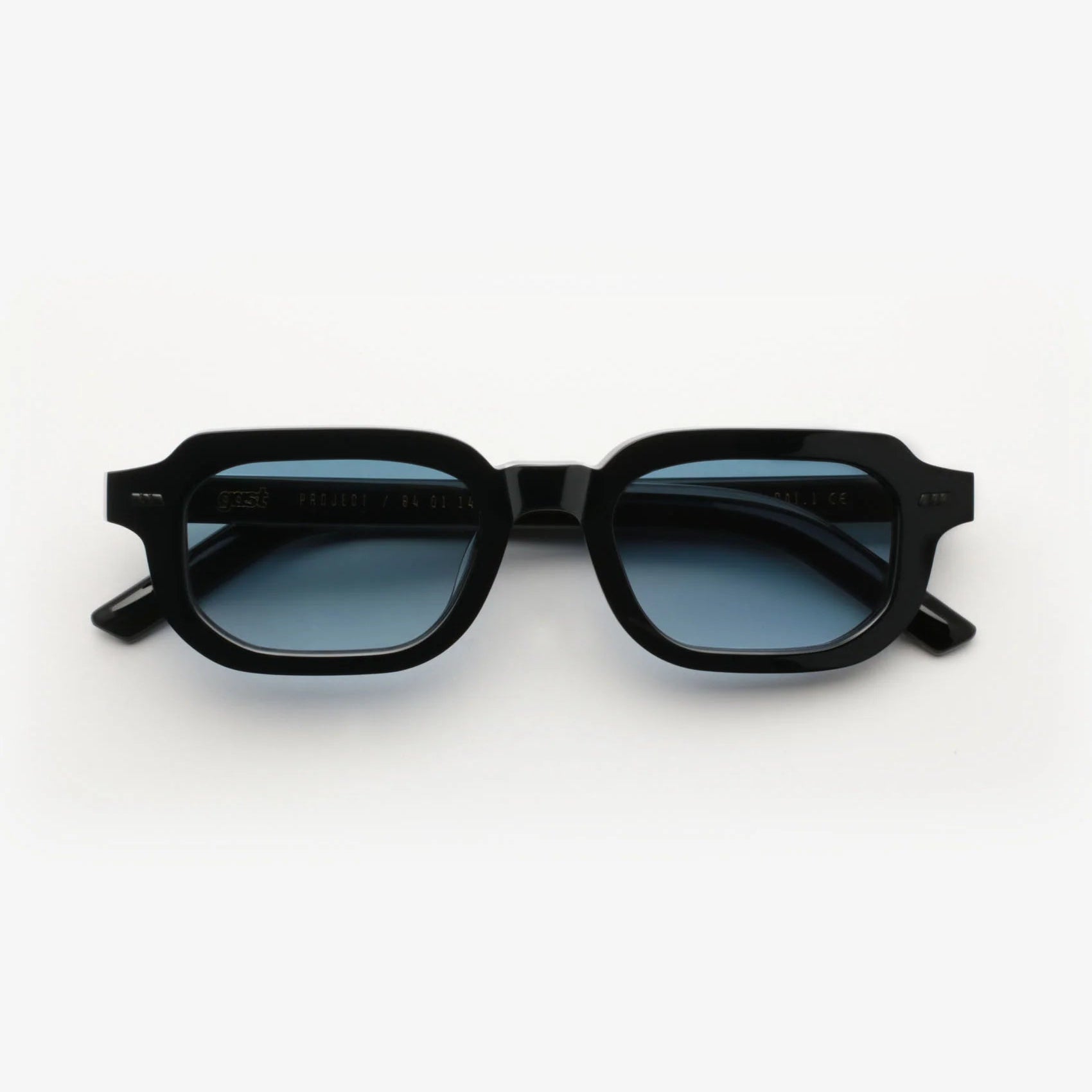 Occhiale da sole fatto a mano con montatura in acetato colore nero lucido e lenti in nylon blu sfumate semi-piatte con anti-riflesso interno - Protezione 100% dai raggi UVA / UVB. Cerniere a cinque snodi. Astuccio premium semi-rigido effetto similpelle e panno in microfibra inclusi.