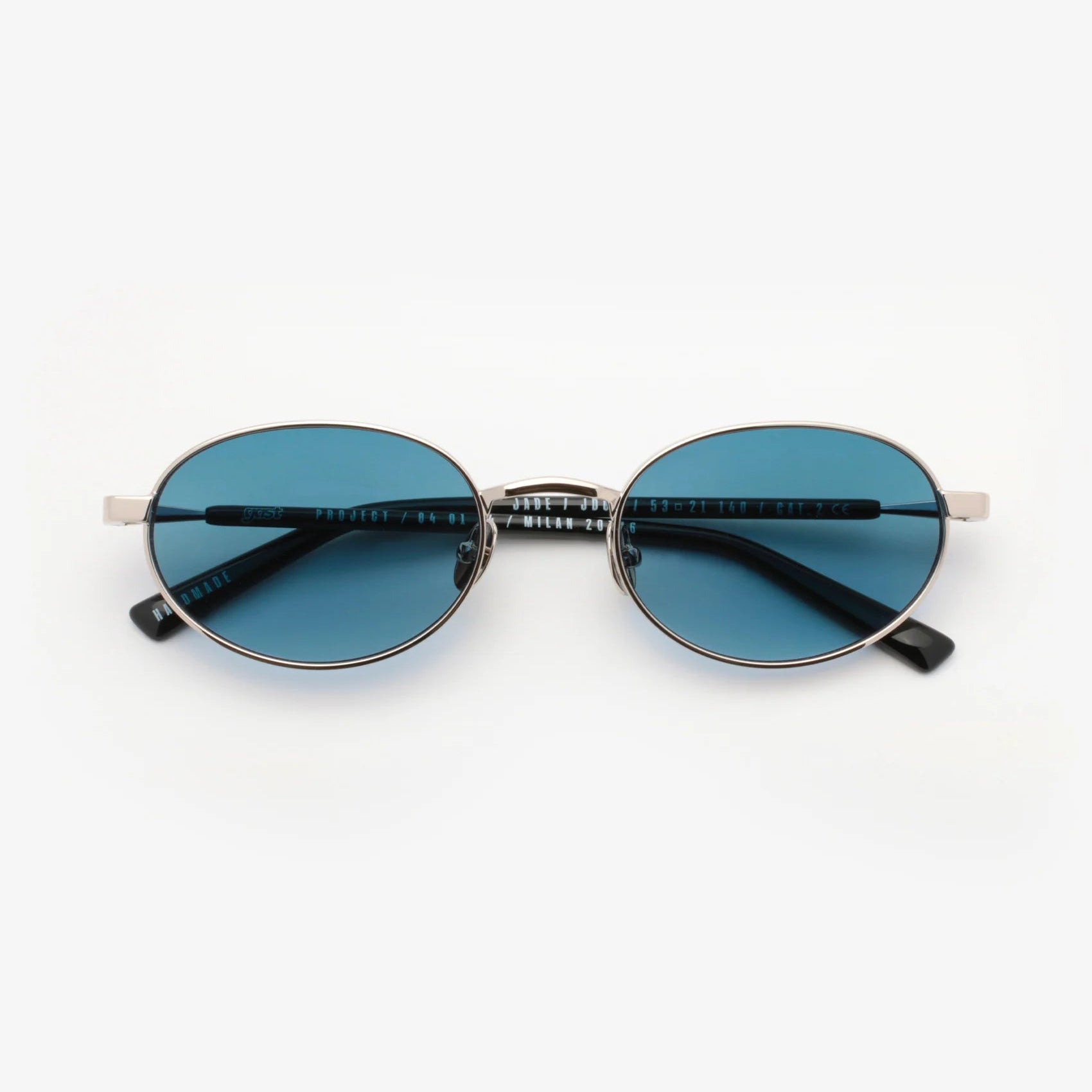 Occhiale da sole fatto a mano con montatura in acciaio nero opaco e aste in acetato nere.