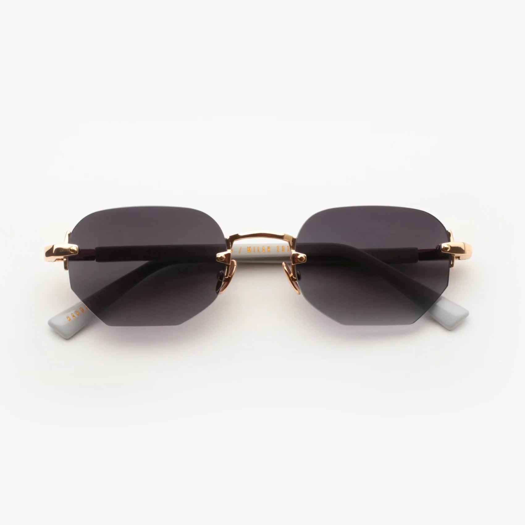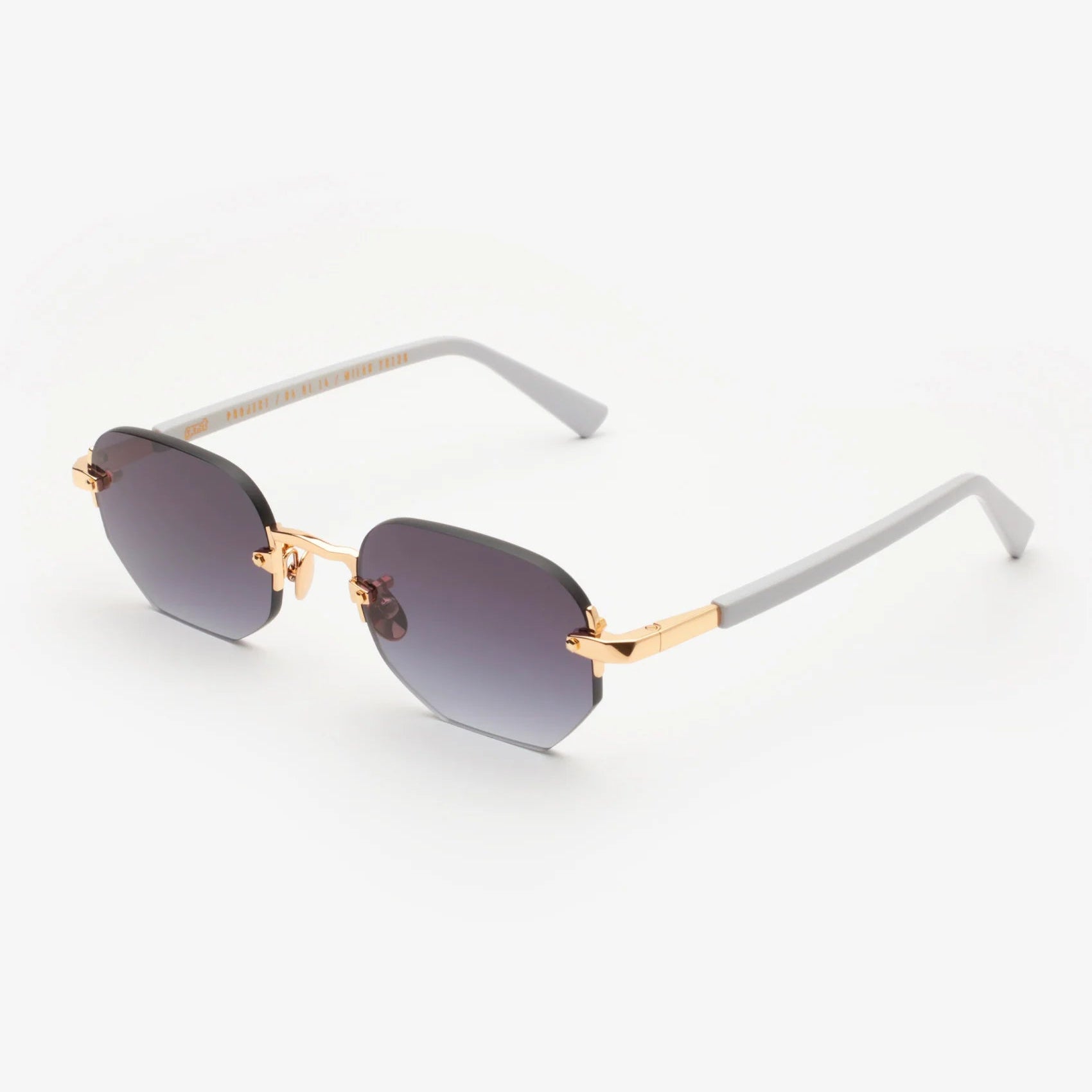 Occhiale da sole rimless fatto a mano con montatura in acciaio oro e aste in acetato azzurro chiaro.
