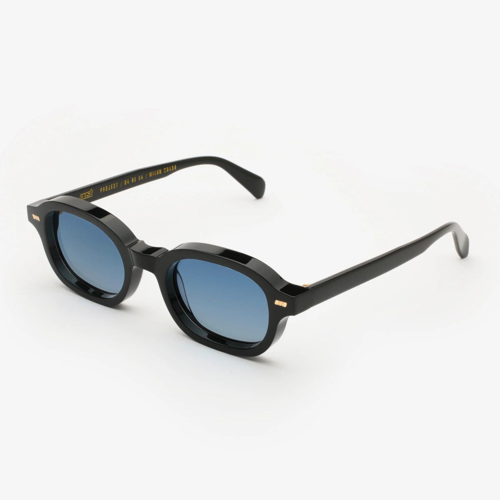 Occhiale da sole fatto a mano con montatura in acetato nero e lenti in nylon blue gradient semi-piatte con anti-riflesso interno - Protezione 100% dai raggi UVA / UVB - Cat.3. Frontale con spessore 8mm. Cerniere a cinque snodi. Astuccio premium semi-rigido effetto similpelle e panno in microfibra inclusi.